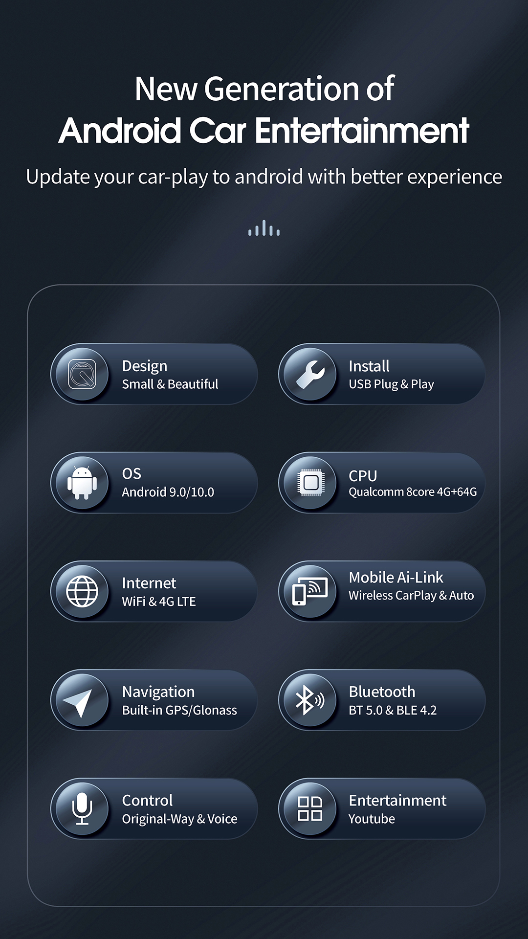 It's an Android Box, plug it into the original CarPlay-USB Port, then it converts the Wired CarPlay Interface to an Full Android Operation System with Wireless Carplay & Wireless Android Auto to link your iPhone or Android Phone