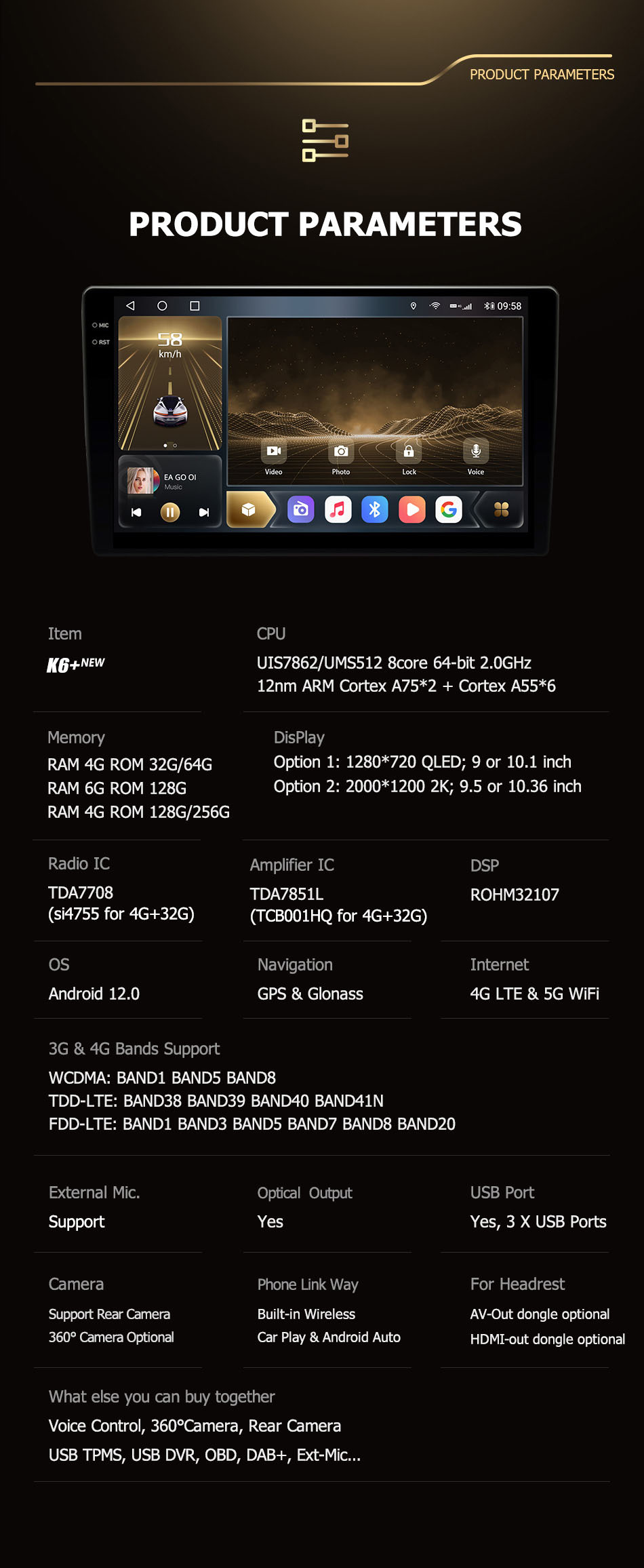 - Built-in GPS, Mobile Phone, MP3 Players, Voice Control, DSP, Carplay, Android Auto, Reversing Input, Split Screen